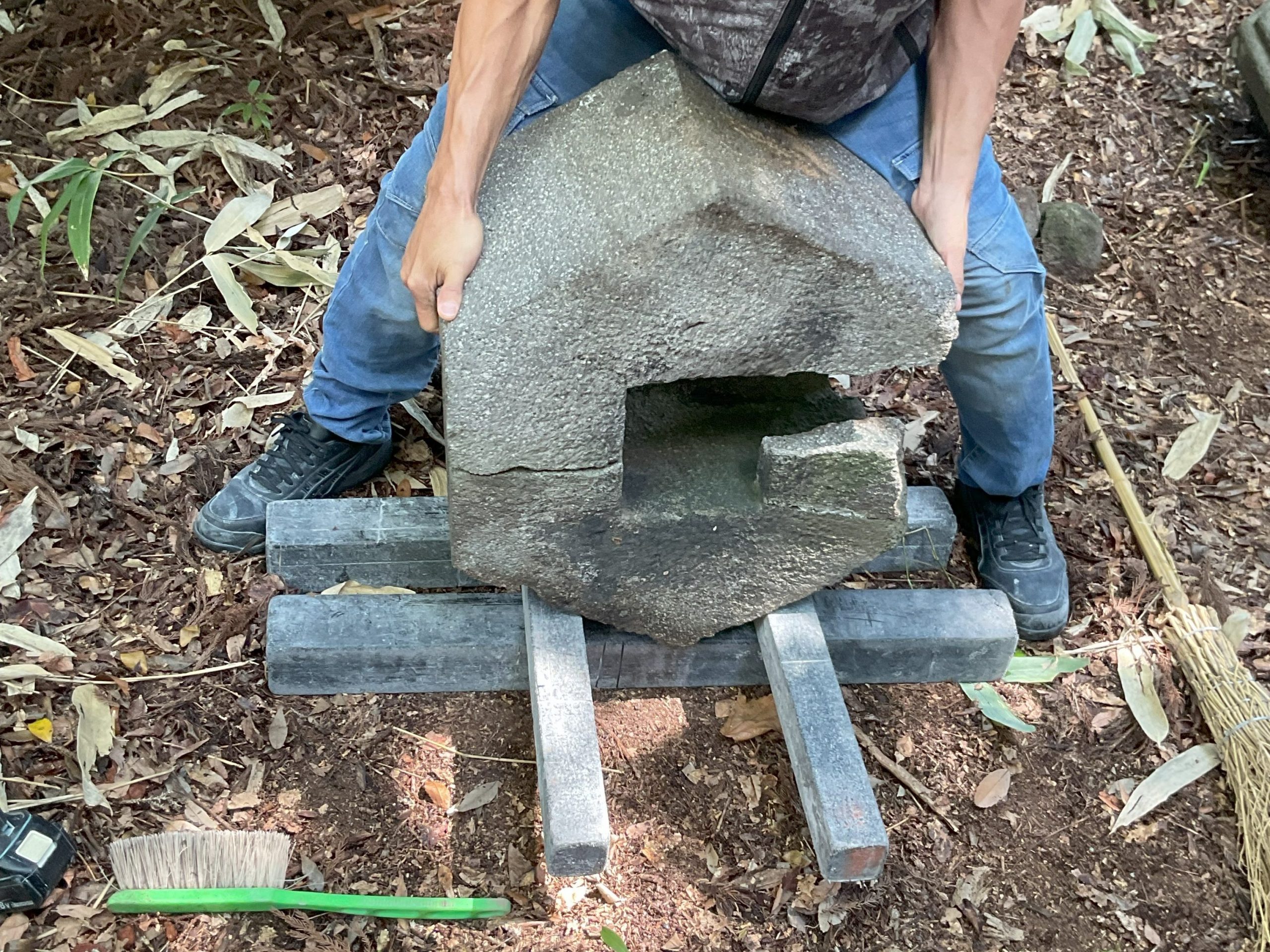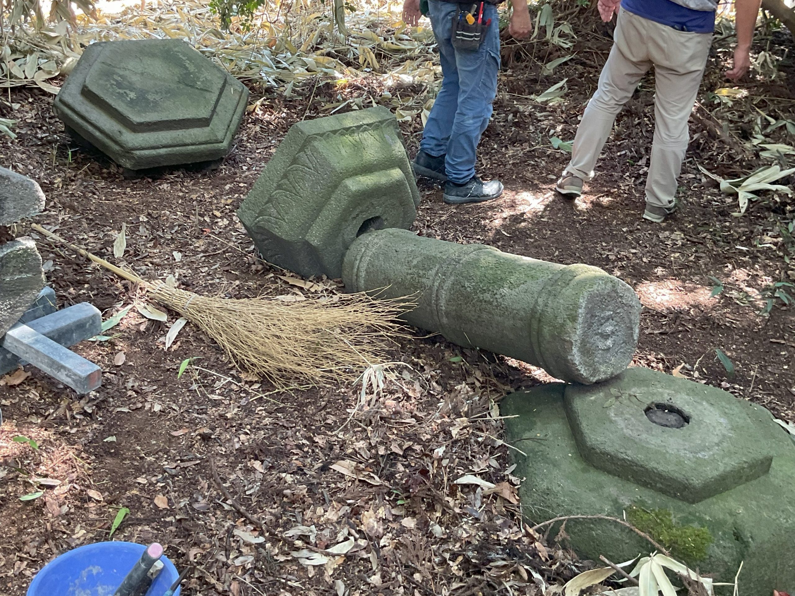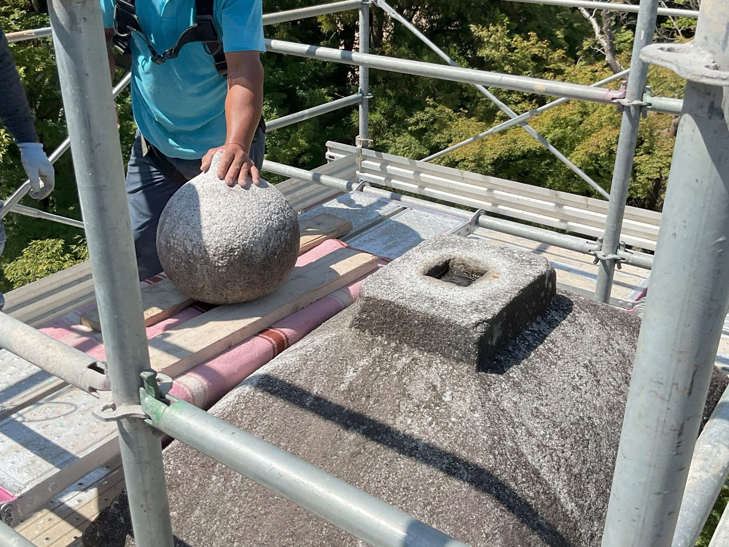 今回は、“宝珠”と呼ばれるお墓の一番上に乗っている球状の石が落下したものを積み直す作業をしました。