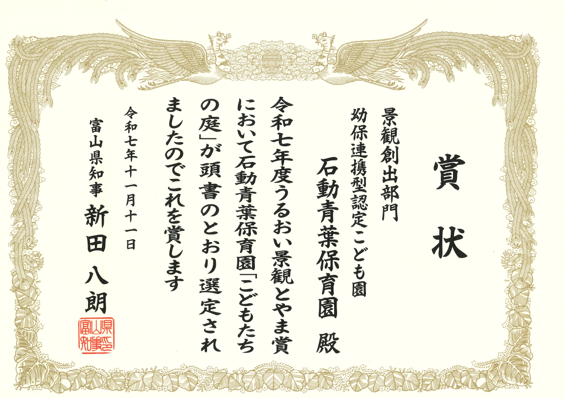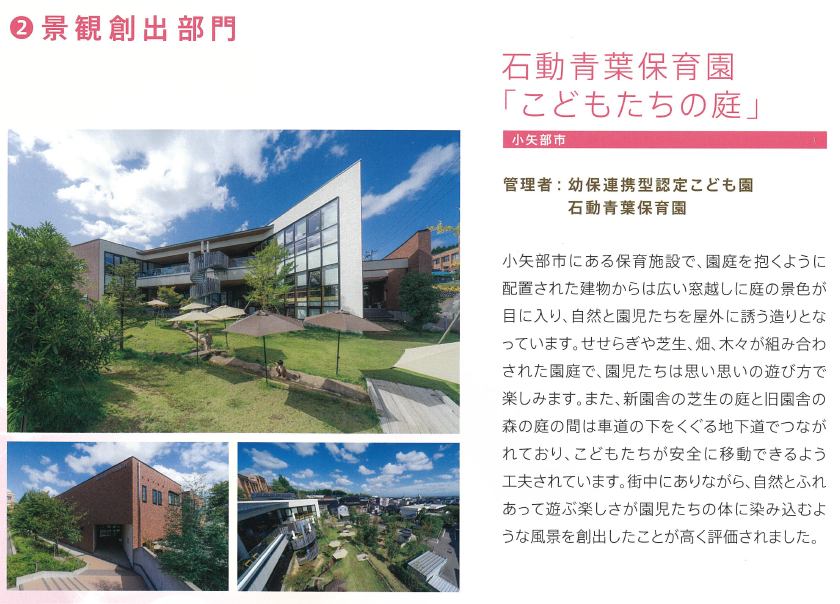 2025.11.28 お知らせ うるおい景観とやま賞を受賞しました うるおい景観とやま賞の景観創出部門に、小矢部市にある石動青葉保育園の園庭が表彰されました! おめでとうございます! 園庭のデザイン・施工を担当させていただいたため、職人共々今後の励みになります! ※うるおい景観とやま賞は、富山県主催で開催され、うるおいややすらぎを感じる景観の写真を、 インスタグラムで指定のハッシュタグを付けて投稿されたものの中から選出される表彰です。 前の記事へ 一覧へ戻る