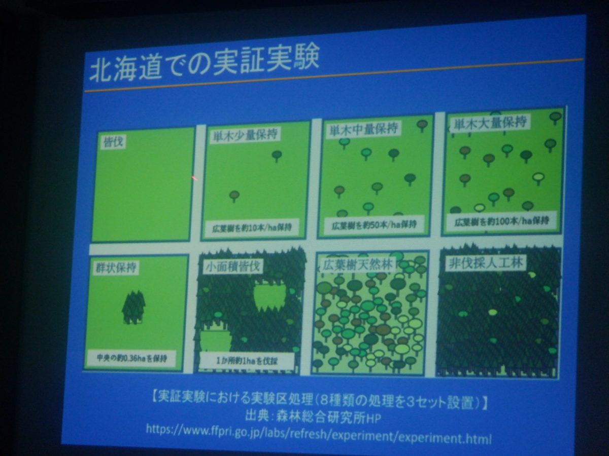 ⇧伐採をした時に、面積当たり何本の木を残せば良いか、実証されました。