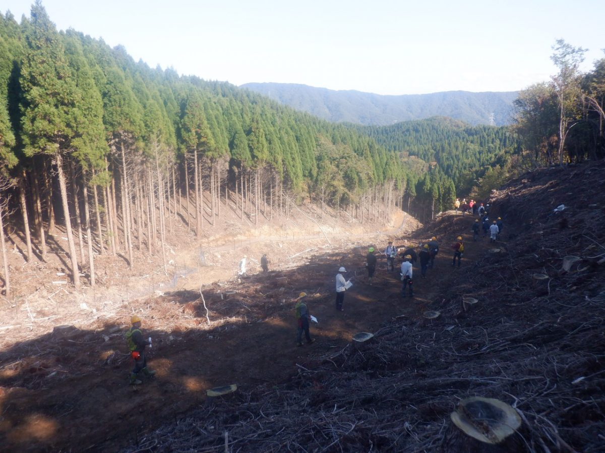 ⇧皆伐のときに作られた作業道を通って現地を歩きました。