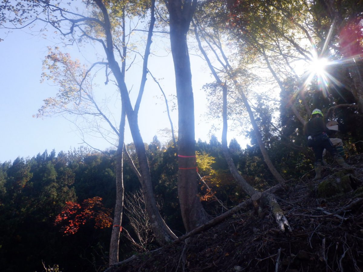 ⇧伐らずに残す樹木はテープを巻いて印がつけられています。
